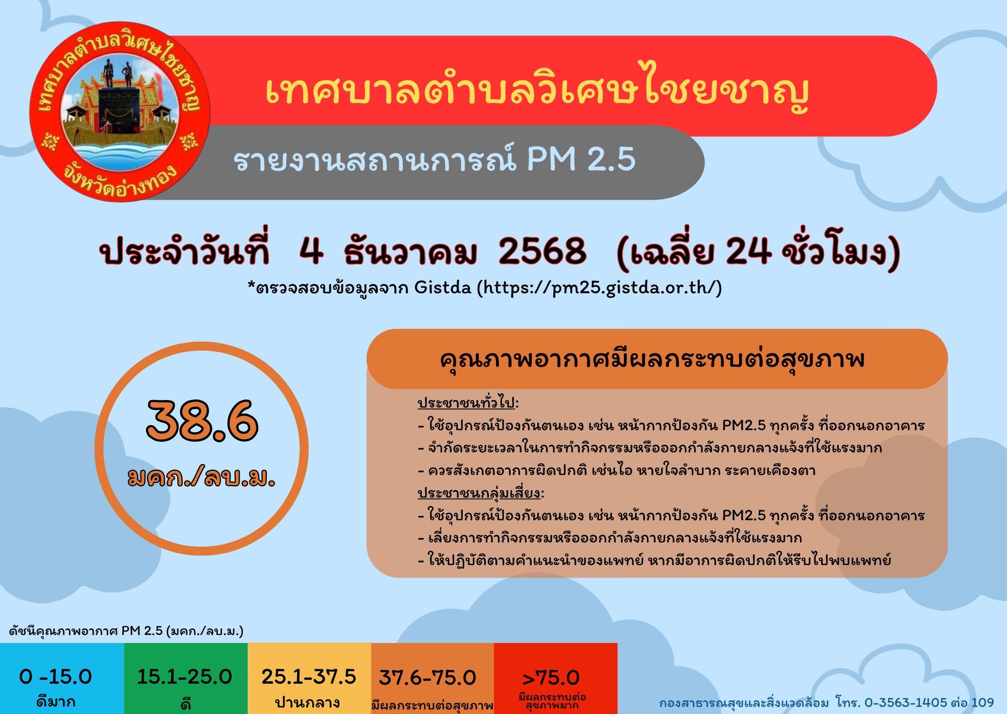 😷ค่าฝุ่นละอองขนาดเล็ก (PM 2.5) เฉลี่ย 24 ชั่วโมง เท่ากับ 38.6 ไมโครกรัม/ลูกบาศก์เมตร